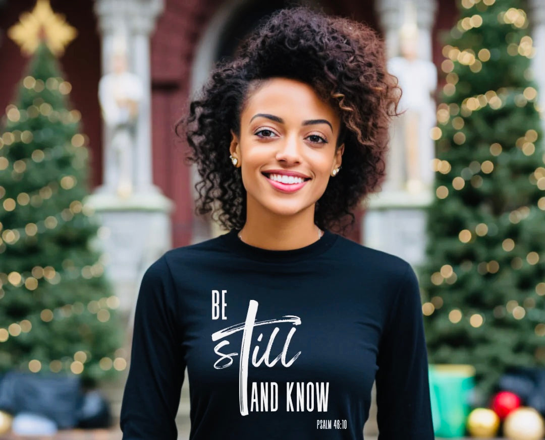This stylish Be Still and Know shirt is made of 100% cotton material, for maximum comfort and durability. The design features the classic phrase "Be Still and Know That I am GOD," making a great statement. Show your faith and fashion with this unique, high-quality product.