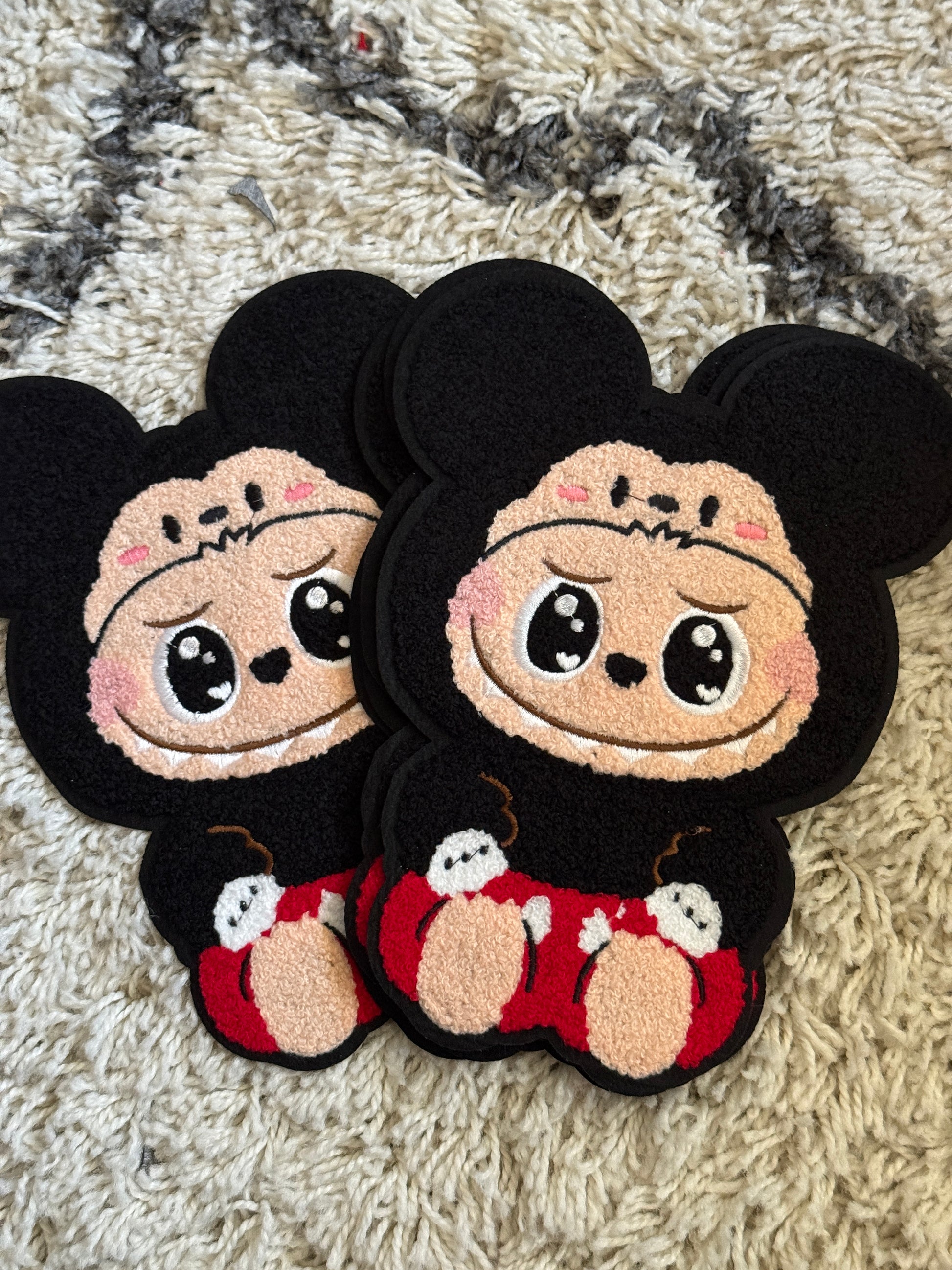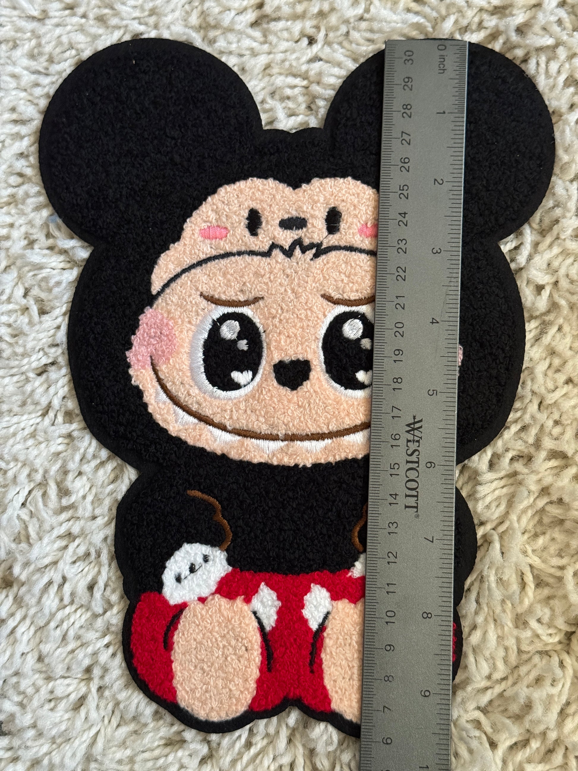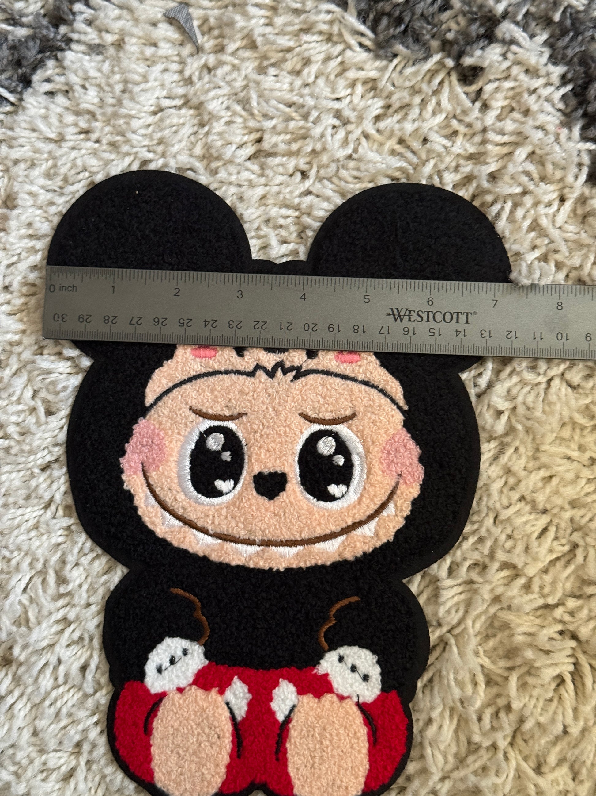 Add a touch of whimsy and collector charm to your wardrobe with this "inspired" Labubu chenille patch dressed in a classic Mickey Mouse outfit. Measuring 7.5 x 9.5 inches, this vibrant, textured patch features high-quality chenille detailing that pops with personality. Whether you're customizing jackets, backpacks, or denim, this patch is easy to apply—iron-on, sew-on, or glue-on with fabric glue or E6000.