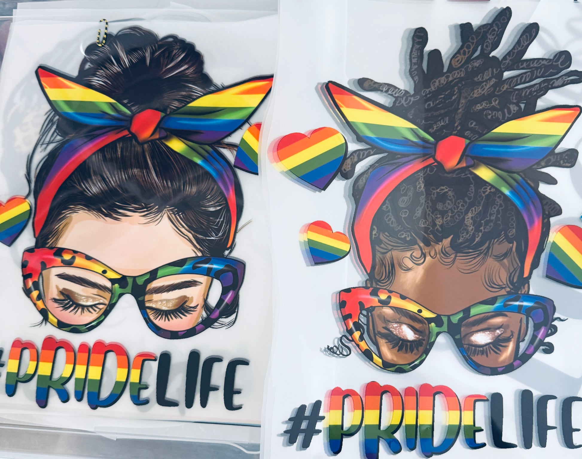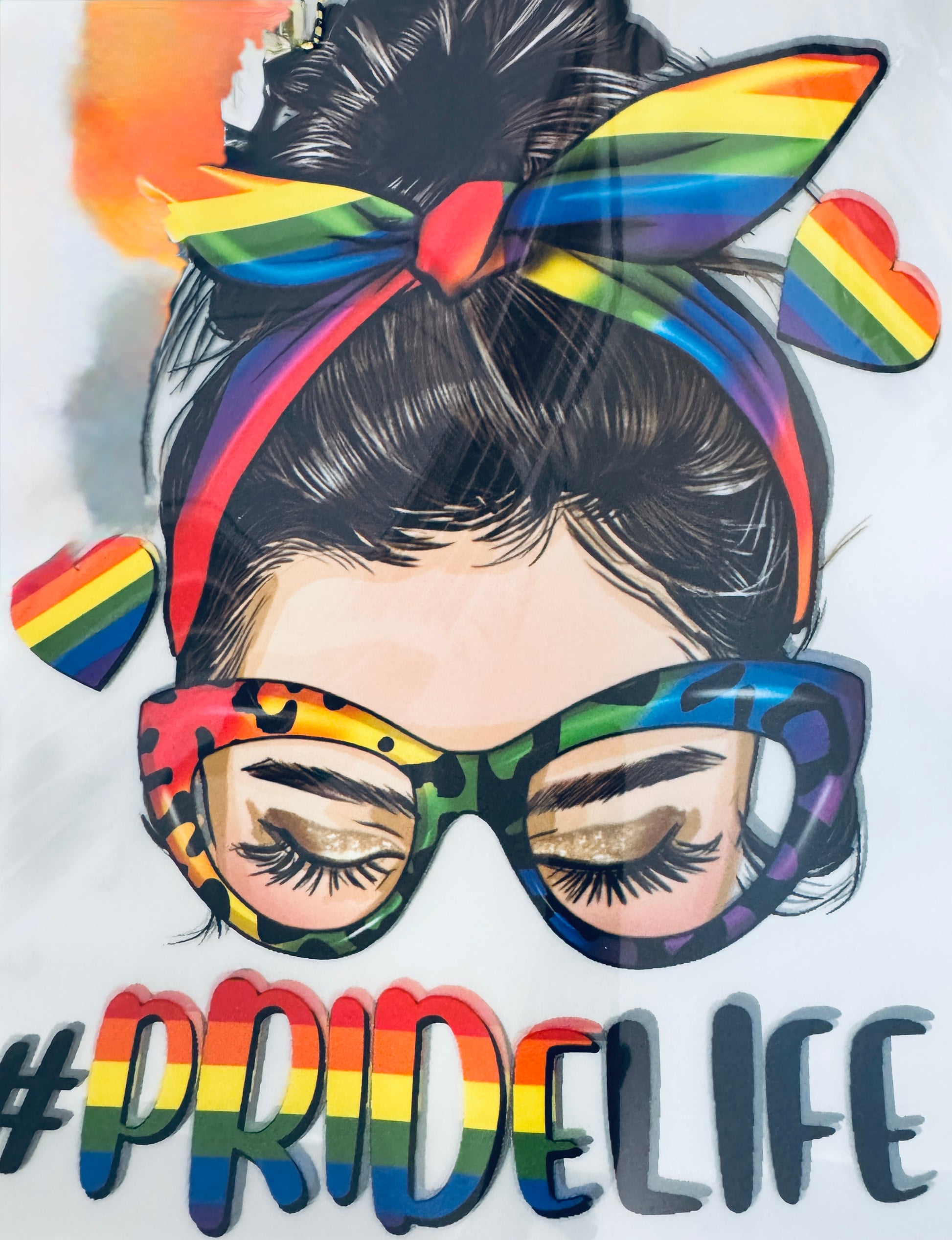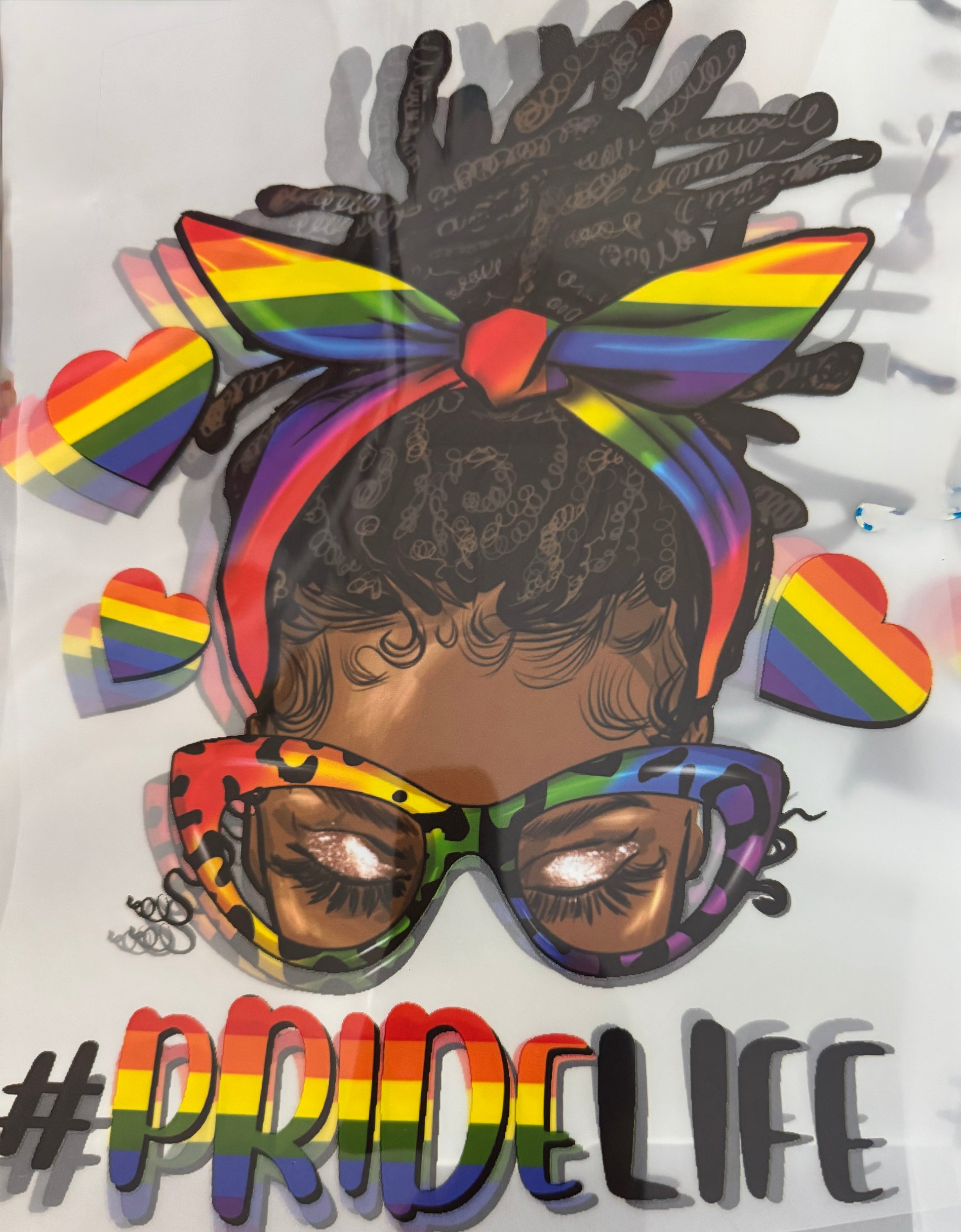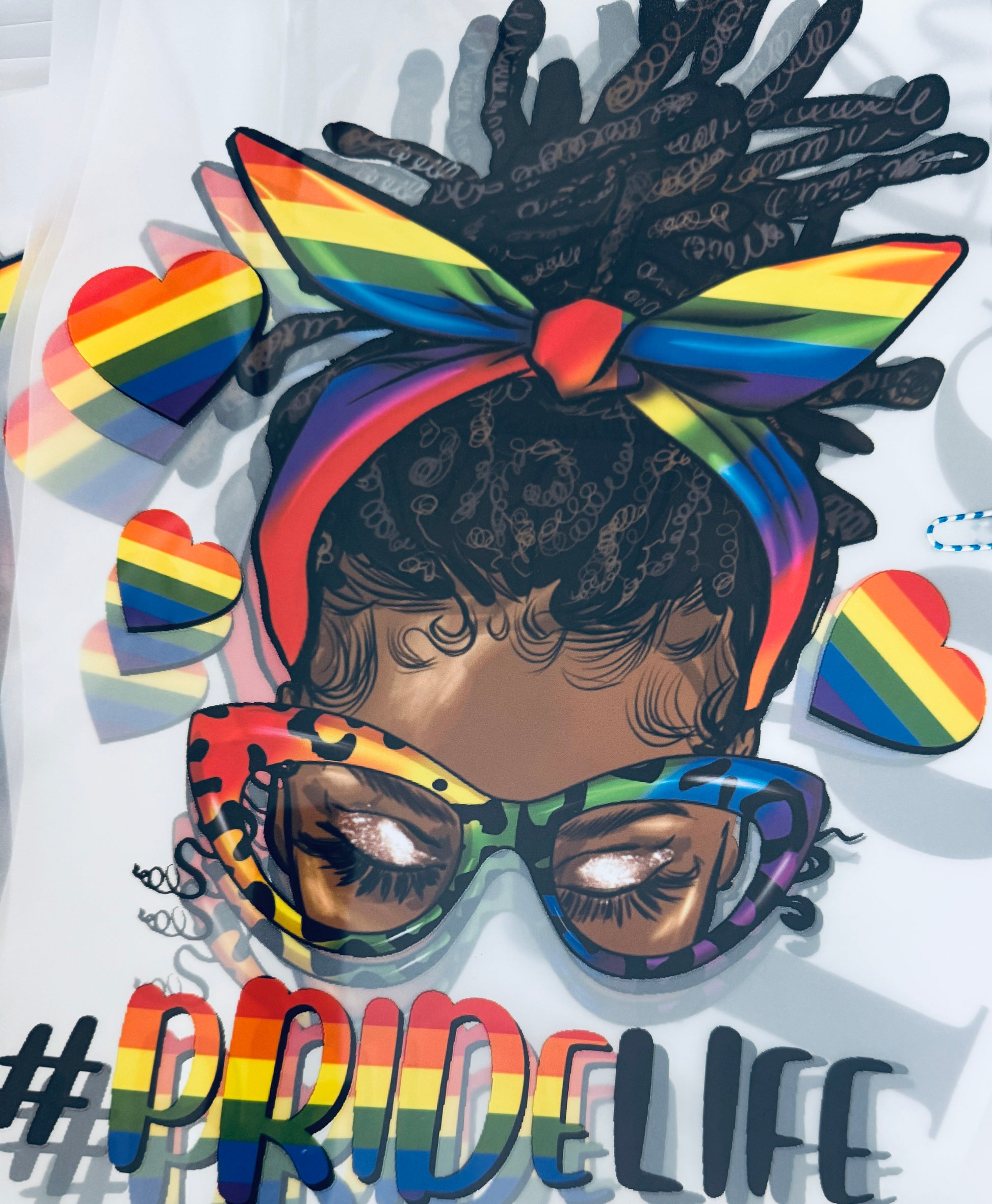 Celebrate Pride with power and style. This eye-catching tee features a beautiful Black woman rocking locs, a vibrant Pride-colored bandana, and matching rainbow-tinted glasses. She’s not just part of the movement—she is the moment. This shirt is a tribute to self-expression, intersectional pride, and unapologetic beauty.