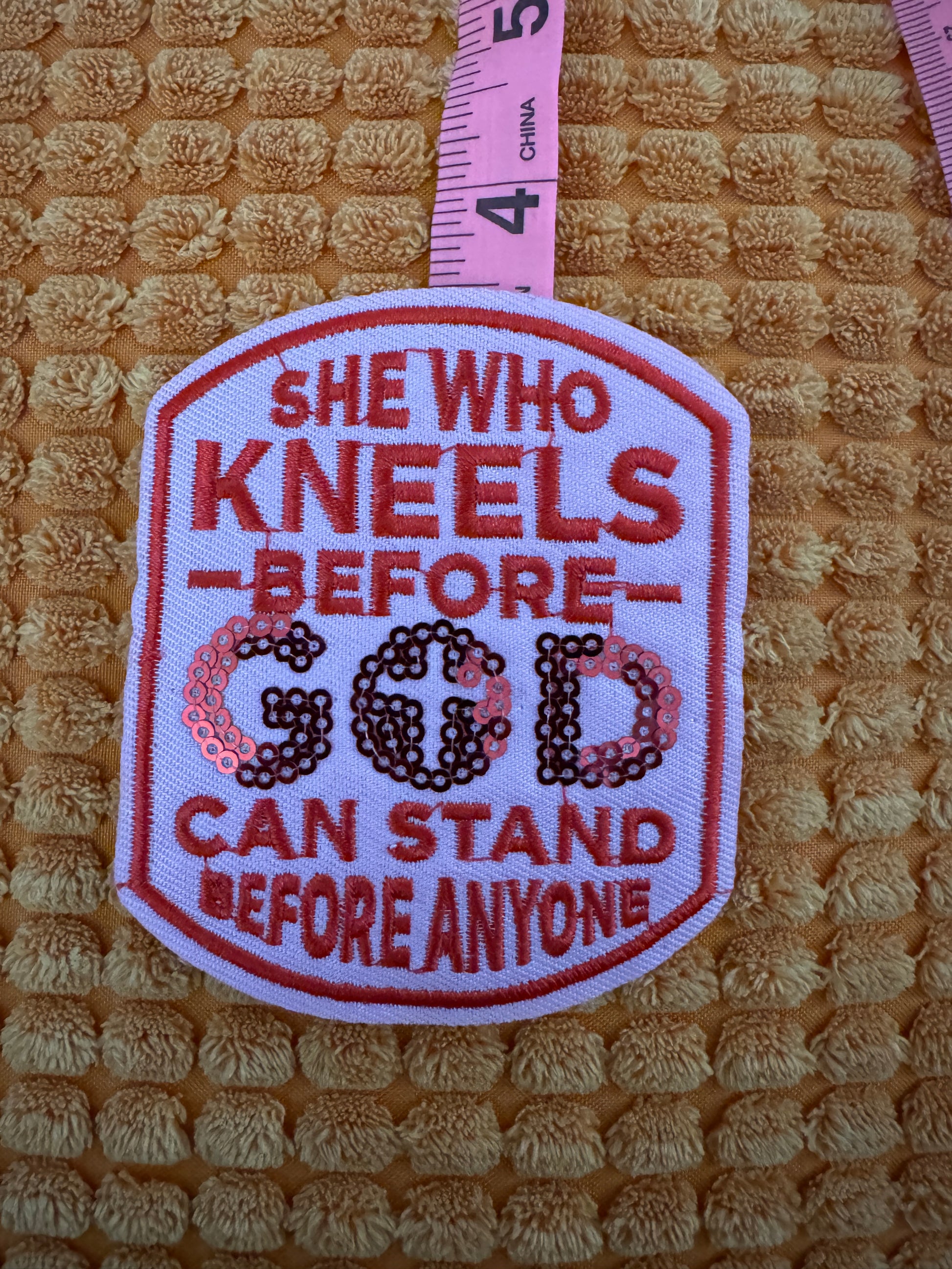 She who kneels before GOD can stand before anyone embroidery and sequin patch